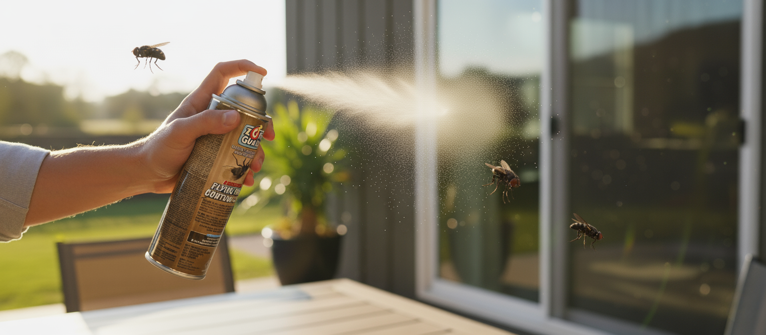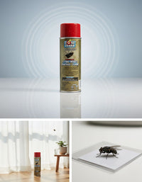Metered pressurized product for indoor use at meat processing plants (not in operation), food processing plants (not in operation), restaurants, food service establishments, hospitals, lodges, resorts, dairies, horse stables, beef barns, dairy barns, and poultry houses to control flies and mosquitoes.